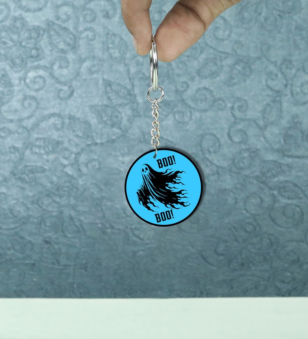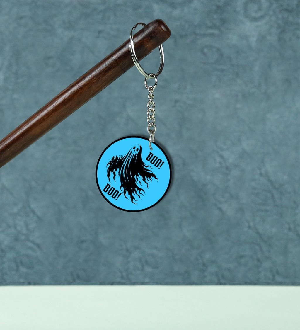 Charming Scary Ghost Saying Boo for Halloween Printed Round Keychain Pack of 2