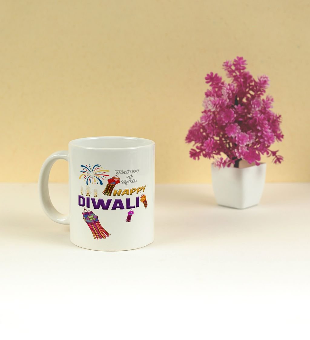 Celebrate the festival of lights with every sip! This beautifully designed Happy Diwali coffee mug adds a festive glow to your mornings and cozy evenings. Featuring vibrant diyas and elegant patterns, it's perfect for gifting or enjoying your favorite brew during the celebrations. Make your Diwali sparkle