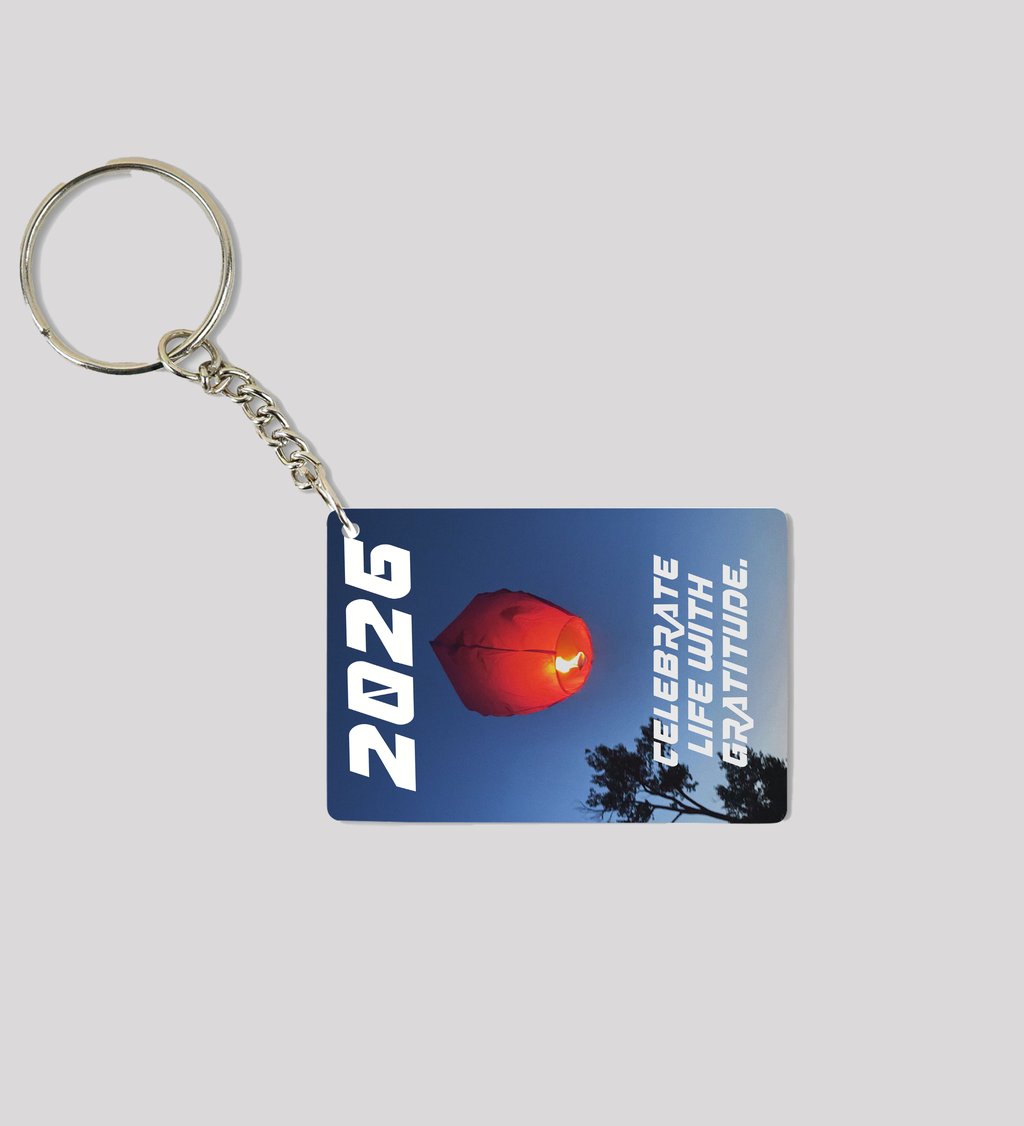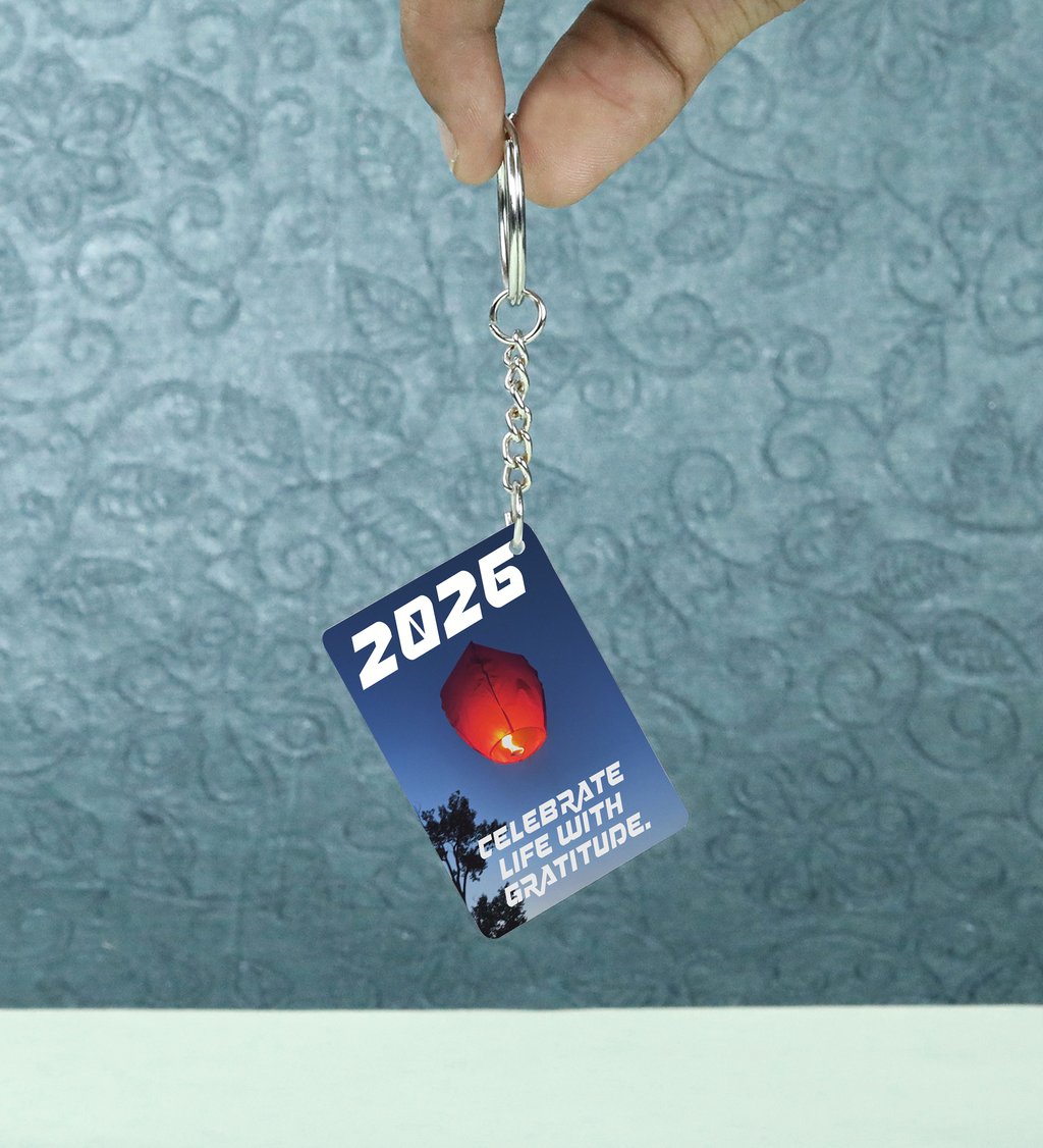 Glowing Red Sky Lantern Floating Above Trees Encouraging Celebration and Gratitude in 2026 Printed Keychain Pack of 2.