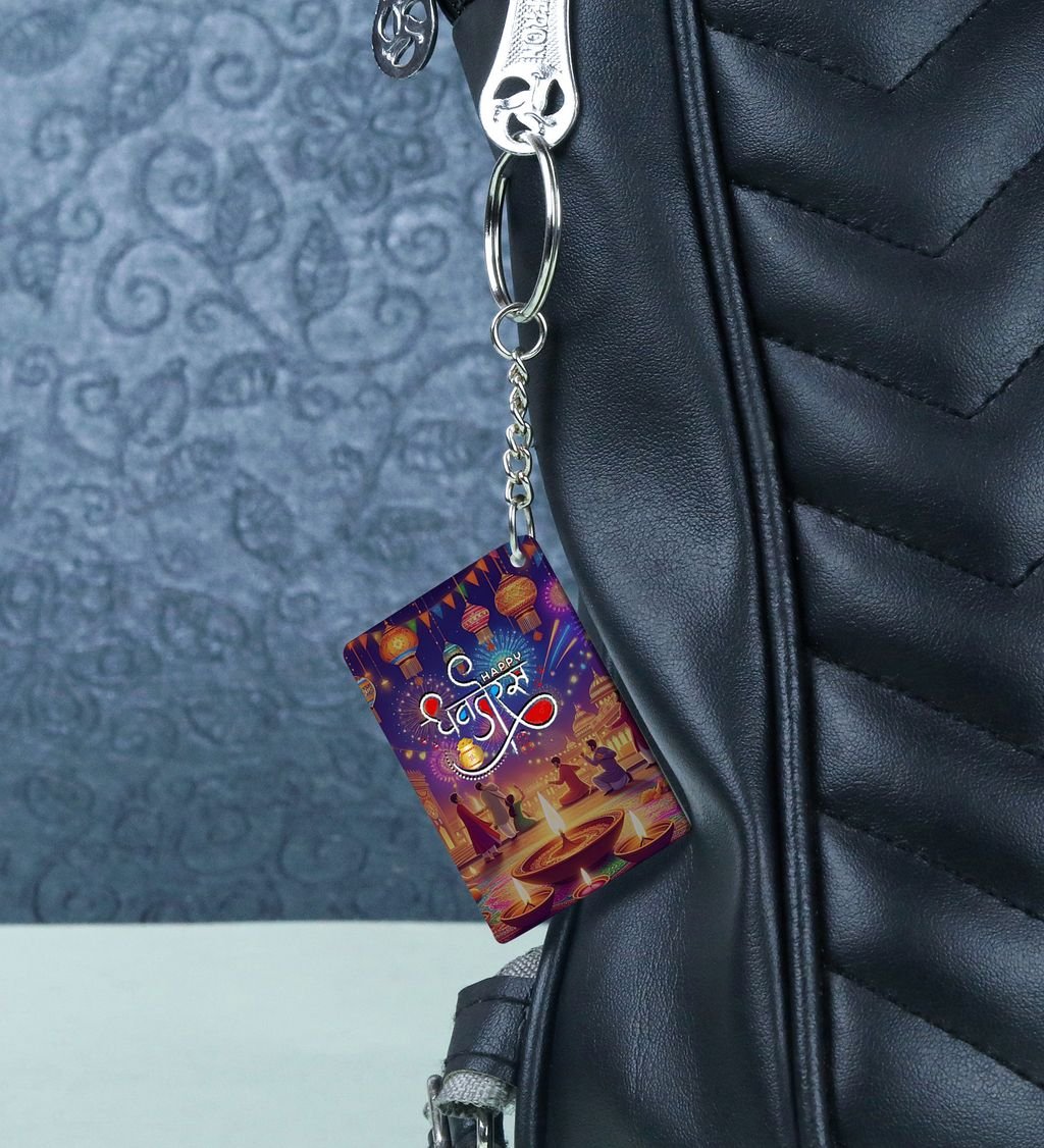 Celebrate the spirit of Deep Utsav with this vibrant rectangular keychain, inspired by the radiant glow of Diwali lamps. Featuring festive colors and intricate patterns, it adds a touch of joy and tradition to your everyday carry. Lightweight and durable, it's perfect for gifting or keeping the festive vibes close all year round. Carry a piece of the festival of lights wherever you go.
